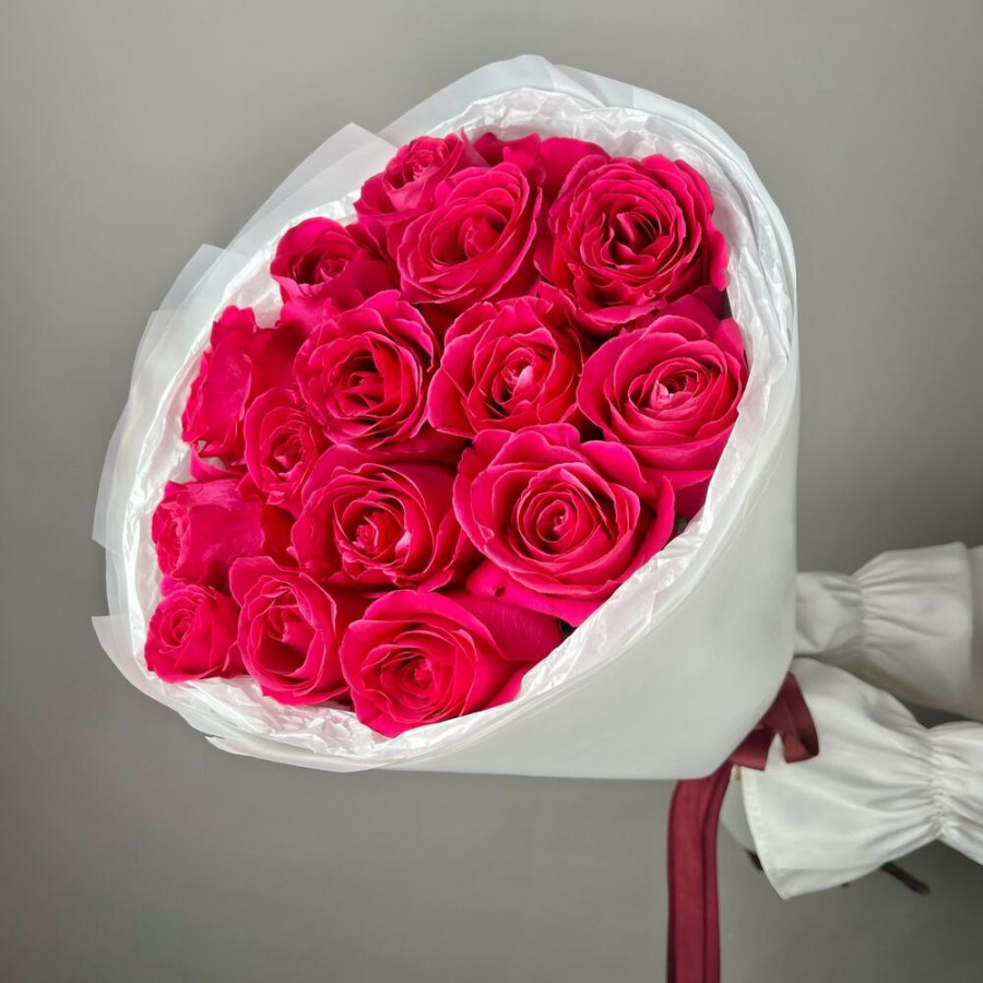 На фото букет из 15 малиновых роз. В составе: роза 15 шт, дизайнерская упаковка 1 шт, атласная лента 1 шт, . Все цветы свежие и ароматные, букет красиво оформлен и отлично подходит для подарка. Доступна доставка цветов или самовывоз.