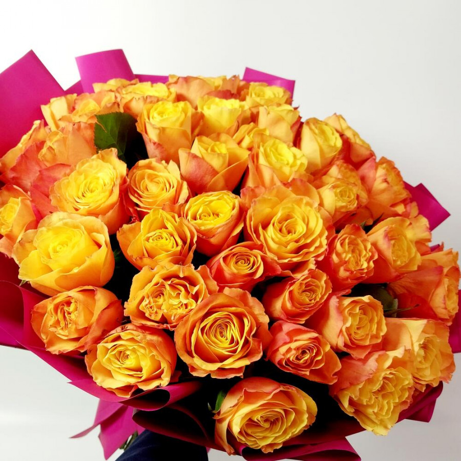 На фото букет из 35 оранжевых роз. В составе: роза 35 шт, дизайнерская упаковка 1 шт, атласная лента 1 шт, . Все цветы свежие и ароматные, букет красиво оформлен и отлично подходит для подарка. Доступна доставка цветов или самовывоз.